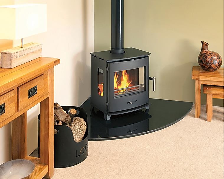 The door is curved and the top plate is a convection design to help distribute heat. As a multifuel design it can burn wood or smokeless coal.